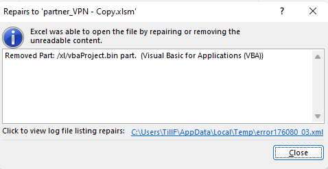 Removed Part:/xl/vbaProject.bin part. (Visual Basic fo Applications (VBA))