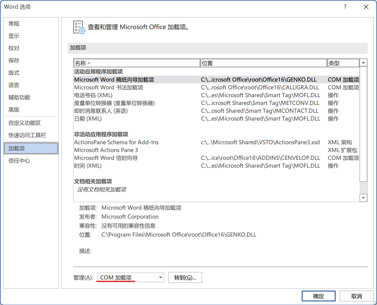 2. 点击 “文件”>“加载项” 按钮,将底部 “管理” 选项调整为 “COM 加载项”,点击 “转到” 按钮 (如下图)。