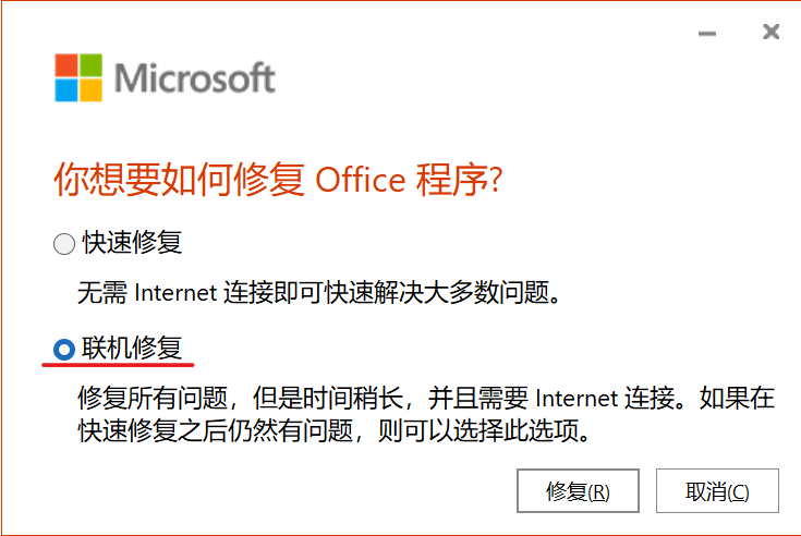 如果上方方案并无效果,请您继续按照下方步骤进行操作,对 Office 产品进行联机修复:
