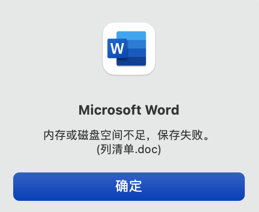 非常抱歉得知您遇到了 “Word 保存文档时提示内存或磁盘空间不足” 的问题!Word 97 - 2003 文档 (*.doc) 格式现已过于久远,在 Mac 设备中无法顺利保存属正常现象。除非文档在 *.docx 格式下完全无法正常工作,我们建议您一律不再使用 *.doc 格式。此问题可能没有可行解决方案,非常遗憾,还希望您能谅解。