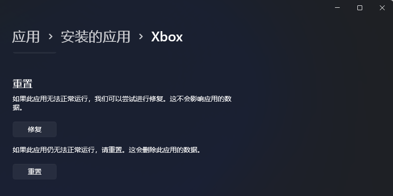 第二条是重置Xbox应用程序(命令为"ms-settings:appsfeatures")