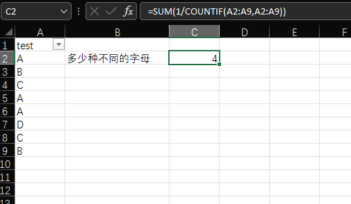 问题作者接受的答案 问题作者接受的答案 匿名 2022-04-24T04:31:57+00:00 您好,塔克威: 欢迎您在我们论坛发帖。 根据您的描述,我们了解到您想要统计标签种类的个数,如果我的理解正确的,可以利用数组公式: =SUM(1/COUNTIF(A2:A17,A2:A17)) 具体的范围请根据您的实际范围进行更改。 以下是我的测试截图,您可以看到一共是4种不同的字母 : 如果我的理解不正确的话, 也请您详细说明您想要得到的数据,我也会继续为您调查以及测试。 希望以上建议能帮助到您。 Tin 请登录以评价此答案。 是 否 2 个人认为此答案很有帮助。 0 个注释 无注释 报告问题