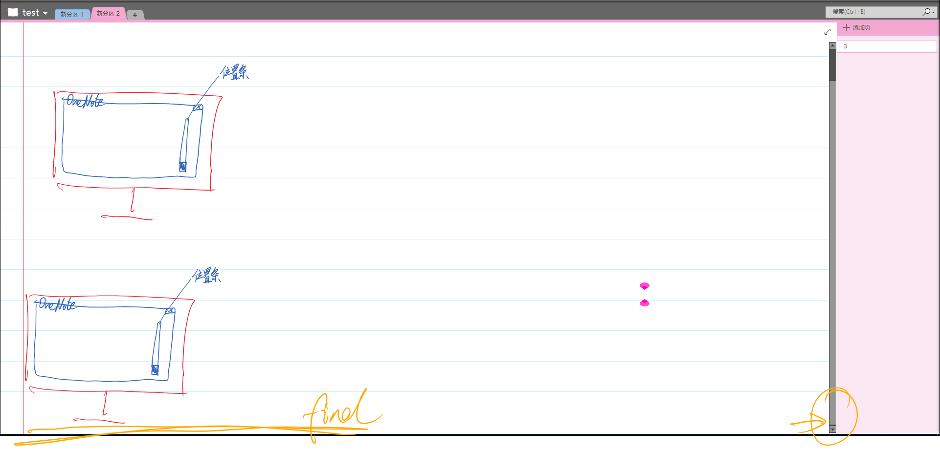 现在的情况是,当前OneNote页到了底部时,鼠标滚轮继续往下滚动是无效的。页面一直会停留在最底部。不会继续往下面追加空白空间。这样如果我们想继续往后面添加新内容很麻烦。我的想法是:如果检测到当前OneNote页到达了底部,这样,继续往后滚动,页面会在最后面添加新页面。(当然,也可以先给用户给出一个提示——是否向下滚动以添加新页面,用户向下滚动添加页面。这个提示也可以选择当前仅提示1次,下次不在提示,直接添加空白页面空间)