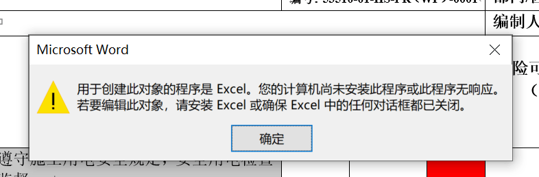 我了解到您word中打开excel文档时出现了报错“用于创建此对象的程序是Excel。 您的计算机尚未安装此程序或此程序无响应。若要编辑此对象,请安装Excel或确保Excel中的任何对话框都已关闭。”