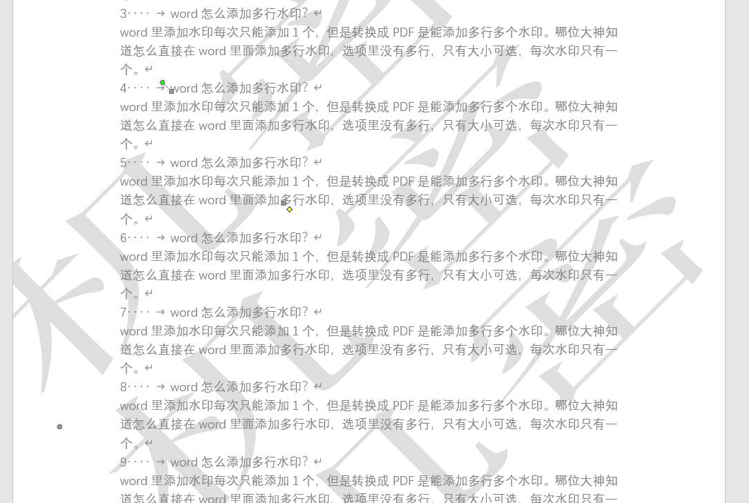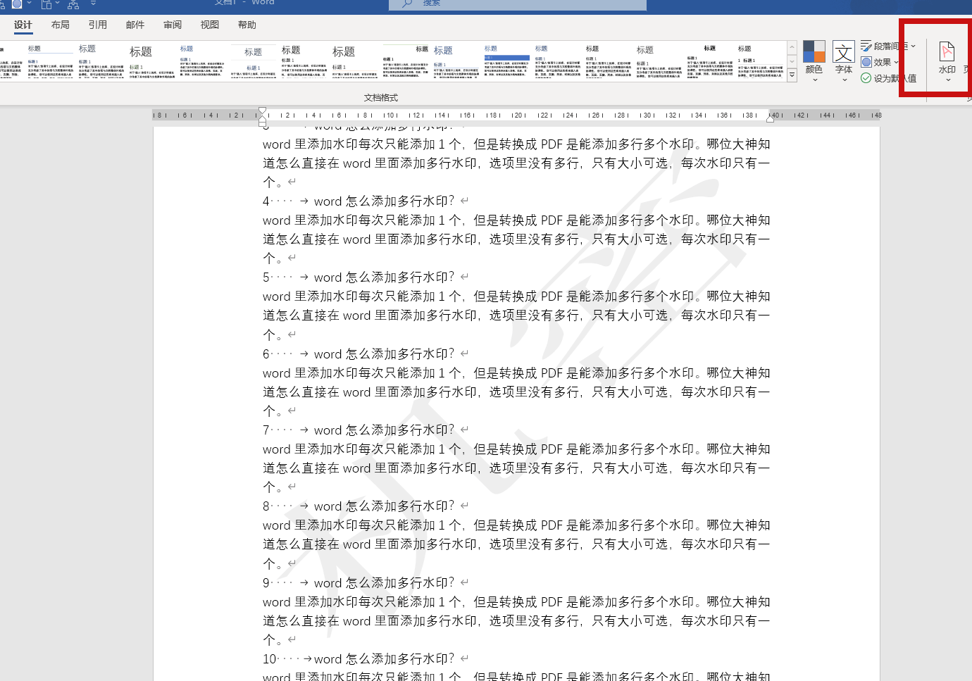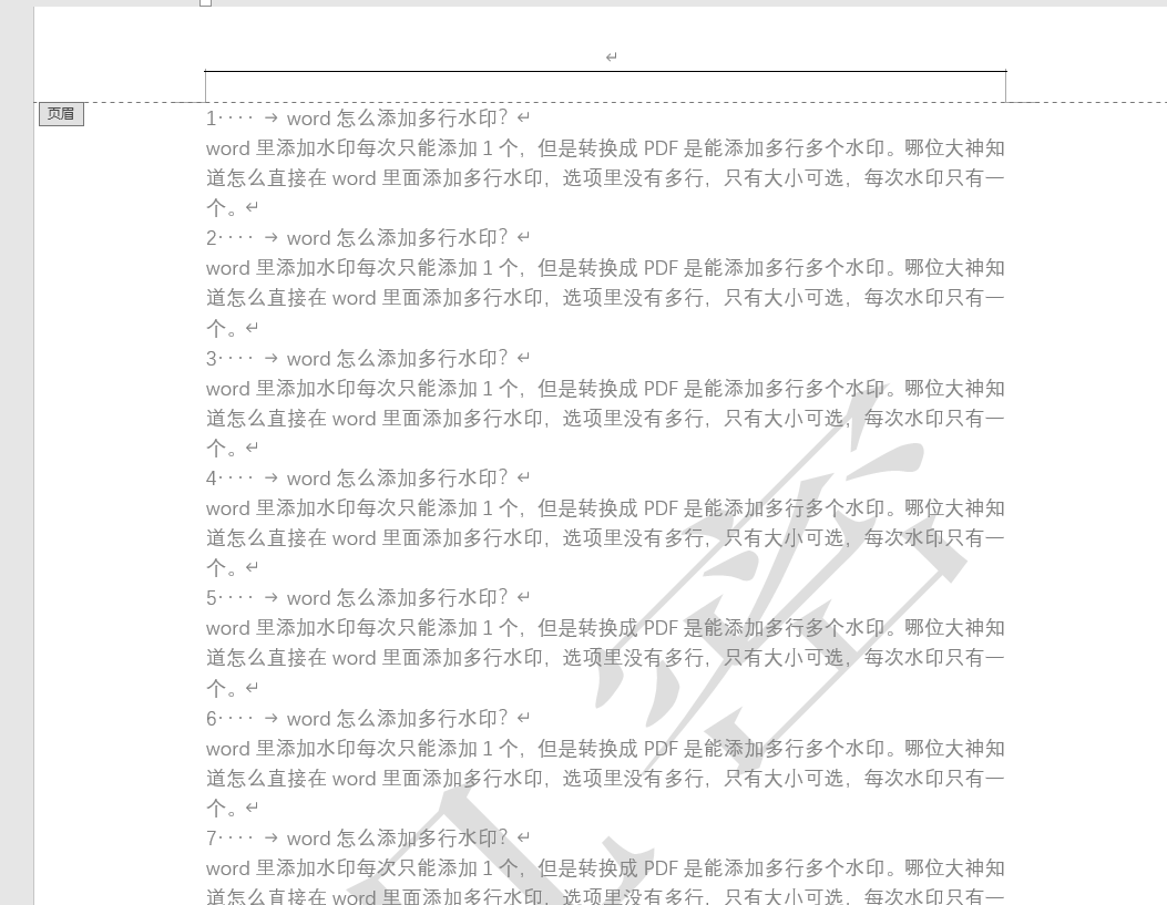 word里添加水印每次只能添加1个,但是转换成PDF是能添加多行多个水印。哪位大神知道怎么直接在word里面添加多行水印,选项里没有多行,只有大小可选,每次水印只有一个。