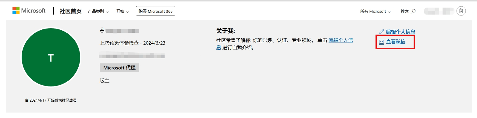 **如何查看私信:**进入微软社区主页:Microsoft Community ,登录您的微软账户,点击"社区个人信息",点击“查看私信”。