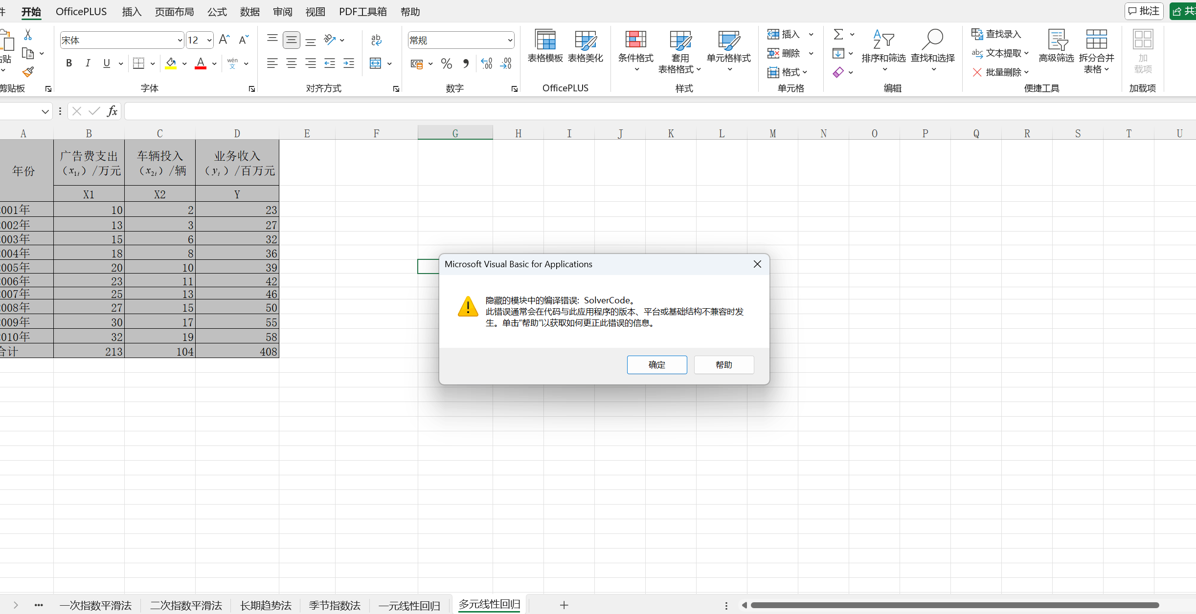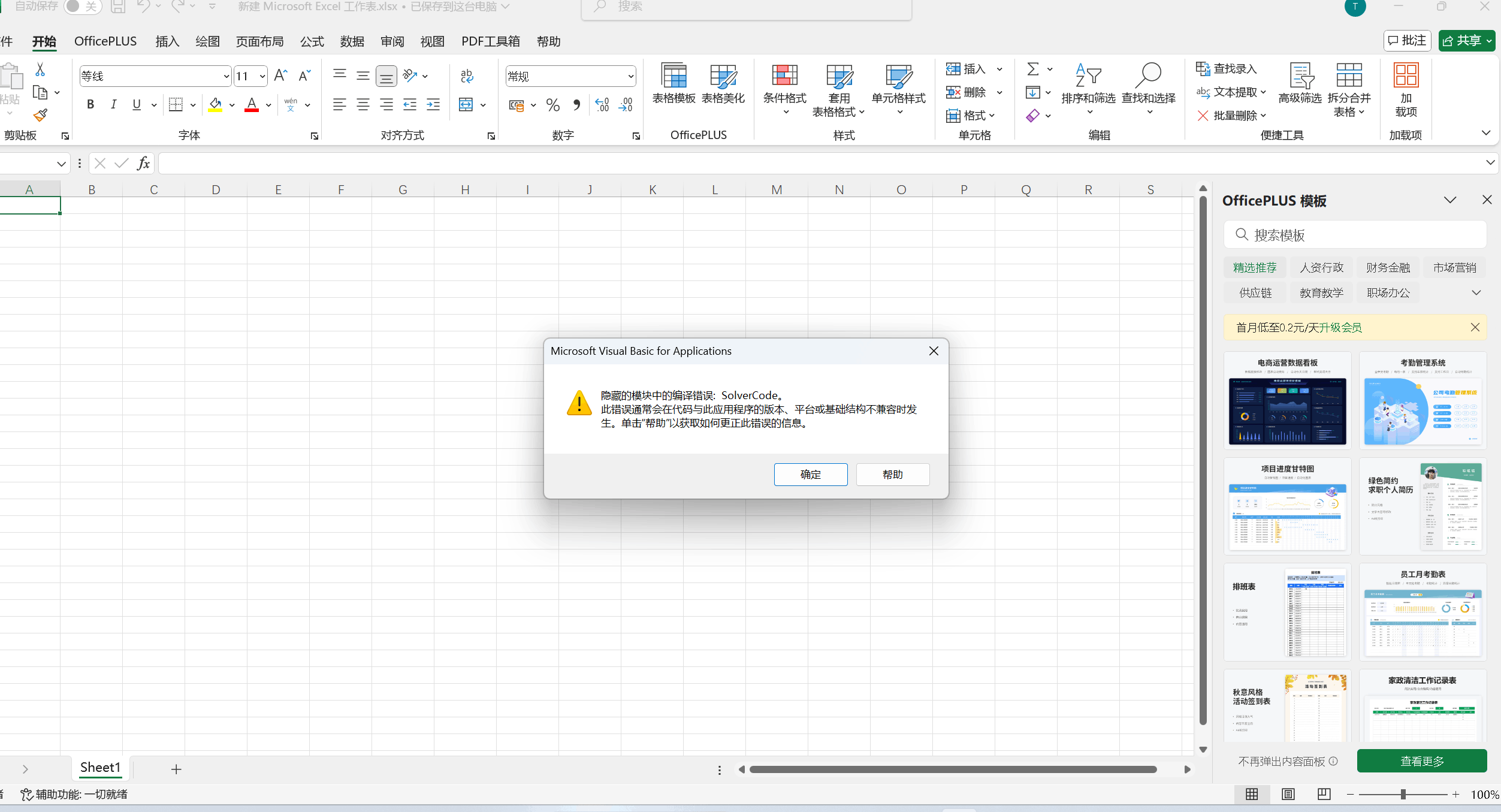 基于您的报错”隐藏的模块中的编译错误:SolverCode",有可能是您的VBA中存在编码错误。