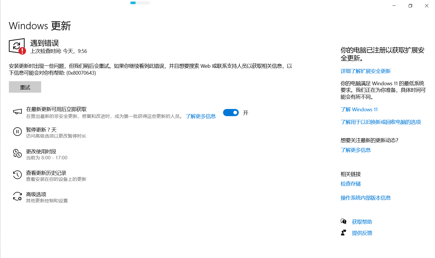 微软Windows 10系统更新已经结束,我重新做了系统,但是微软Windows 10系统更新 遇到错误,不能更新升级到Windows 11系统 Windows10 系统更新错误代码(0x80070643)希望微软帮助我解决问题,升级Windows11系统