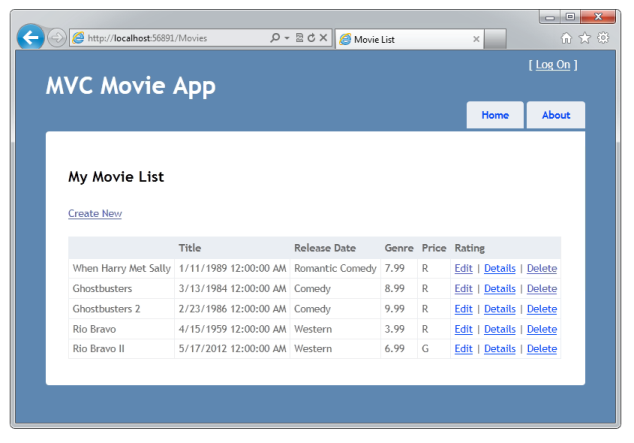 该 MovieInitializer 类指定应删除模型使用的数据库,并在模型类发生更改时自动重新创建。 该代码包含一种方法 Seed ,用于指定一些默认数据,以在创建数据库时自动添加到数据库(或重新创建)。 这提供了一种有用的方法来使用一些示例数据填充数据库,而无需在每次更改模型时手动填充它。