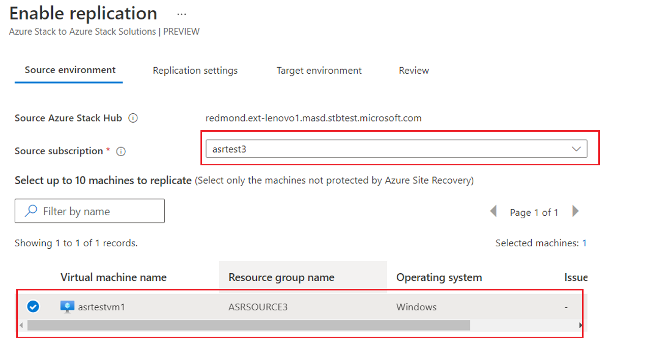 然后,边栏选项卡会要求你选择源环境和源订阅。 应会看到配置的用户 (或 SPN) 有权访问的所有 Azure Stack Hub 用户订阅。