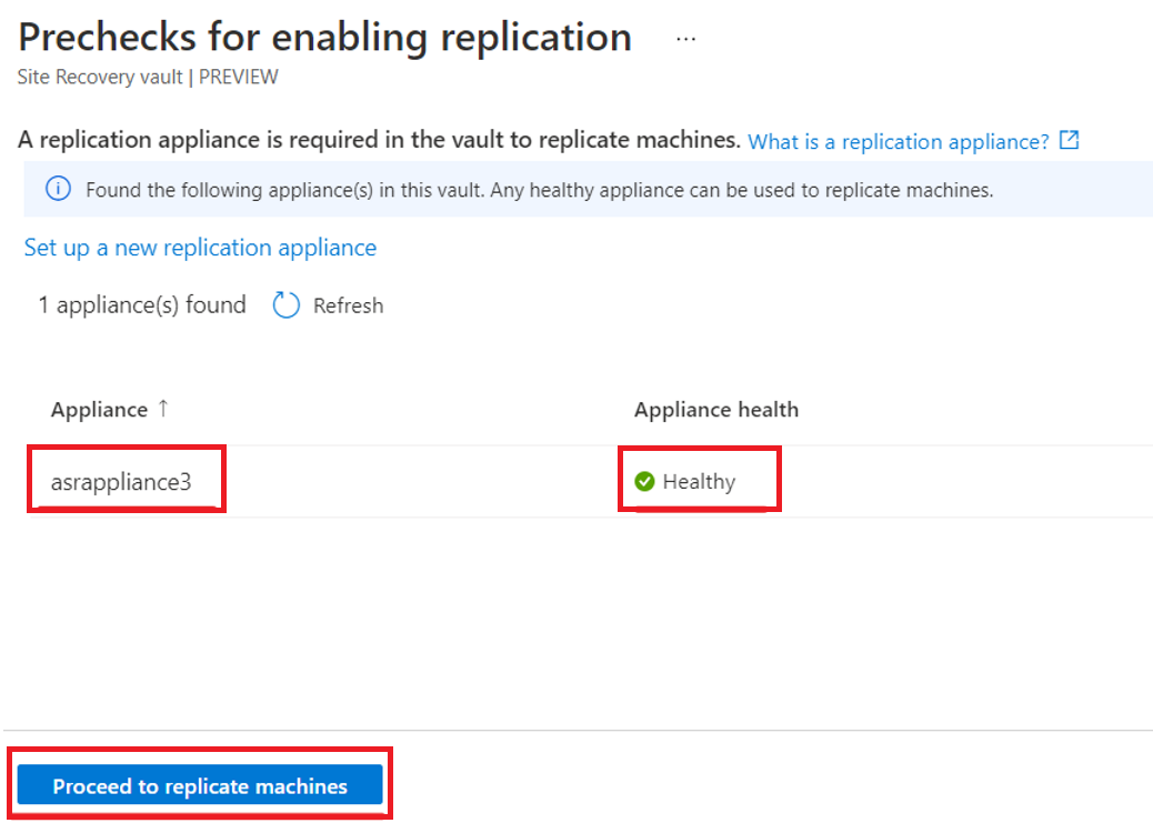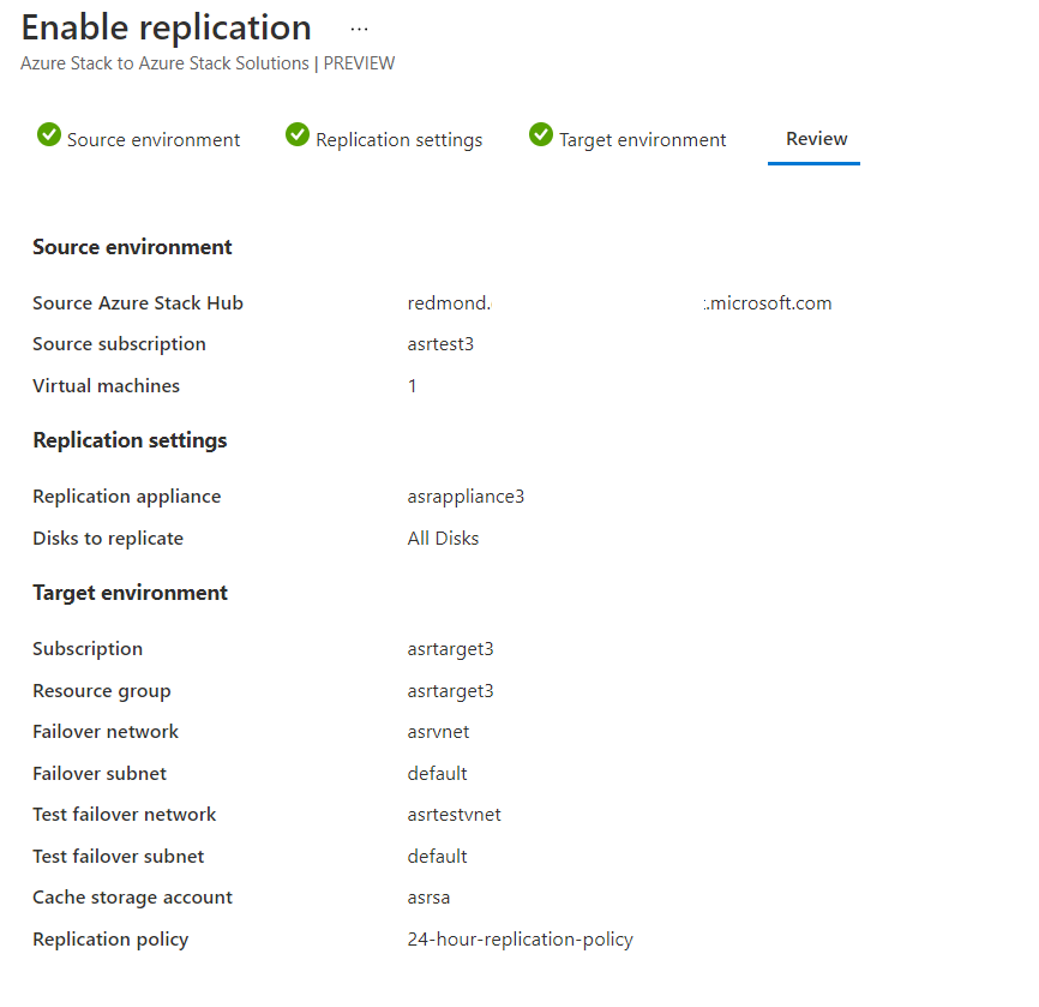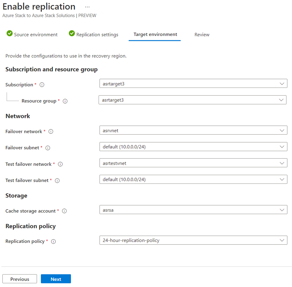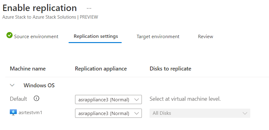 配置目标和源环境后,可以开始启用 VM 保护(从源到目标)。 所有配置均在目标环境上的 Site Recovery 保管库本身中完成。