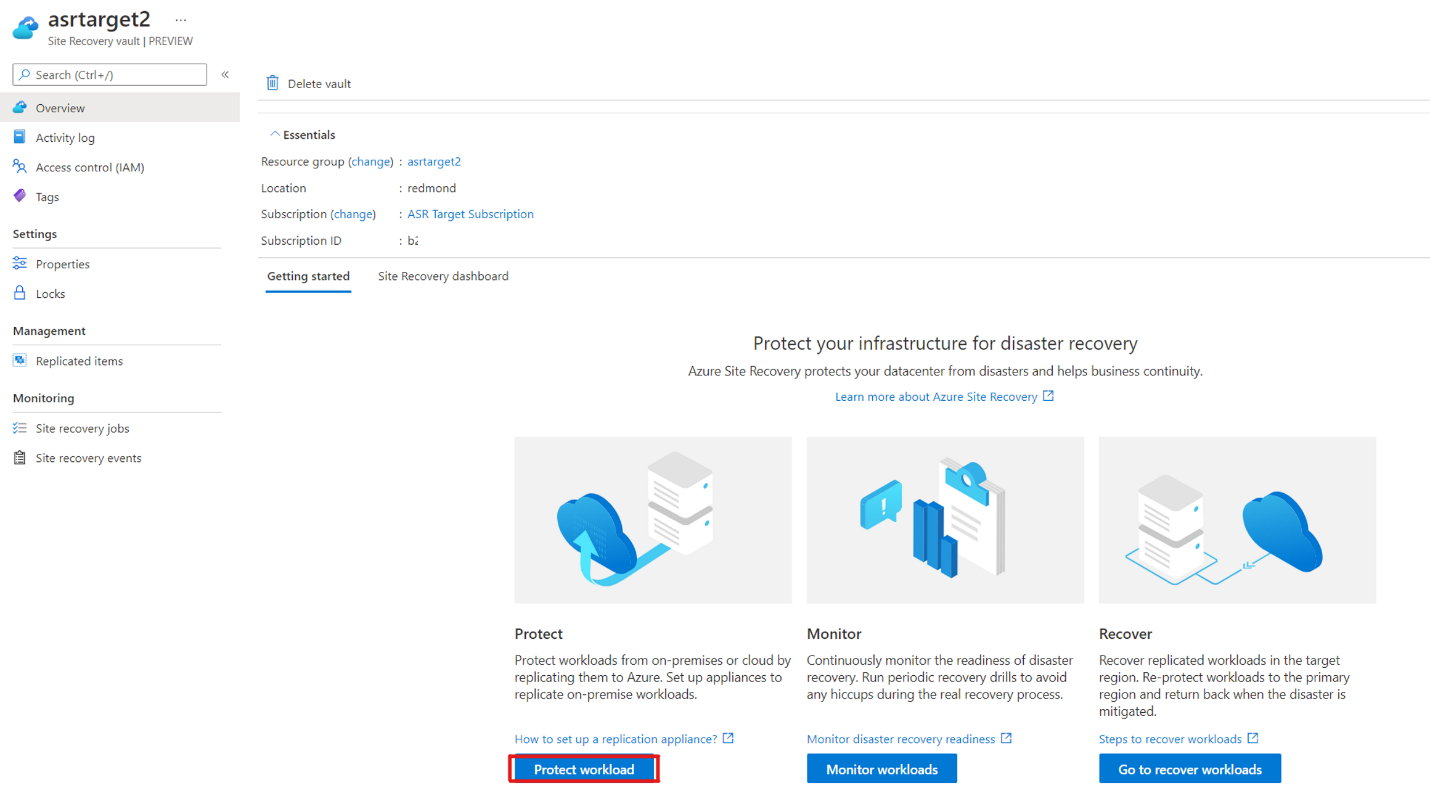 在目标环境中的 Azure Stack Hub 用户门户上,打开 Site Recovery 保管库并选择“保护工作负载”: