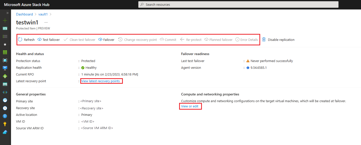 选择这些项可以查看当前状态、编辑该受保护项的设置,或触发测试故障转移等操作: