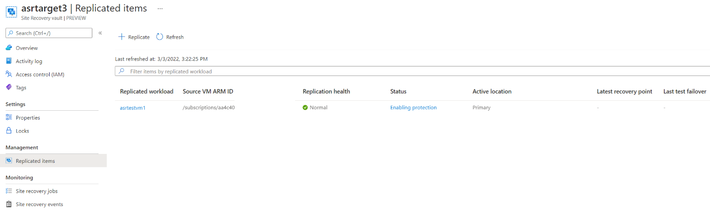 在 Site Recovery 保管库的“复制的项”边栏选项卡中,可以看到为其启用了复制的每个 VM: