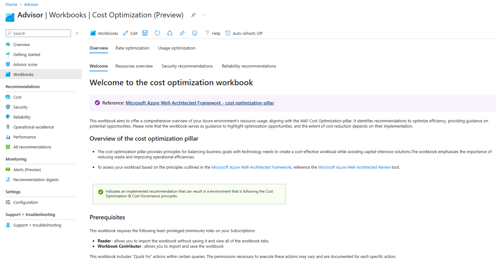 Azure 成本优化工作簿旨在提供概述并帮助优化 Azure 环境的成本。 它提供一组与架构良好的框架成本优化支柱一致的与成本相关的见解和建议。