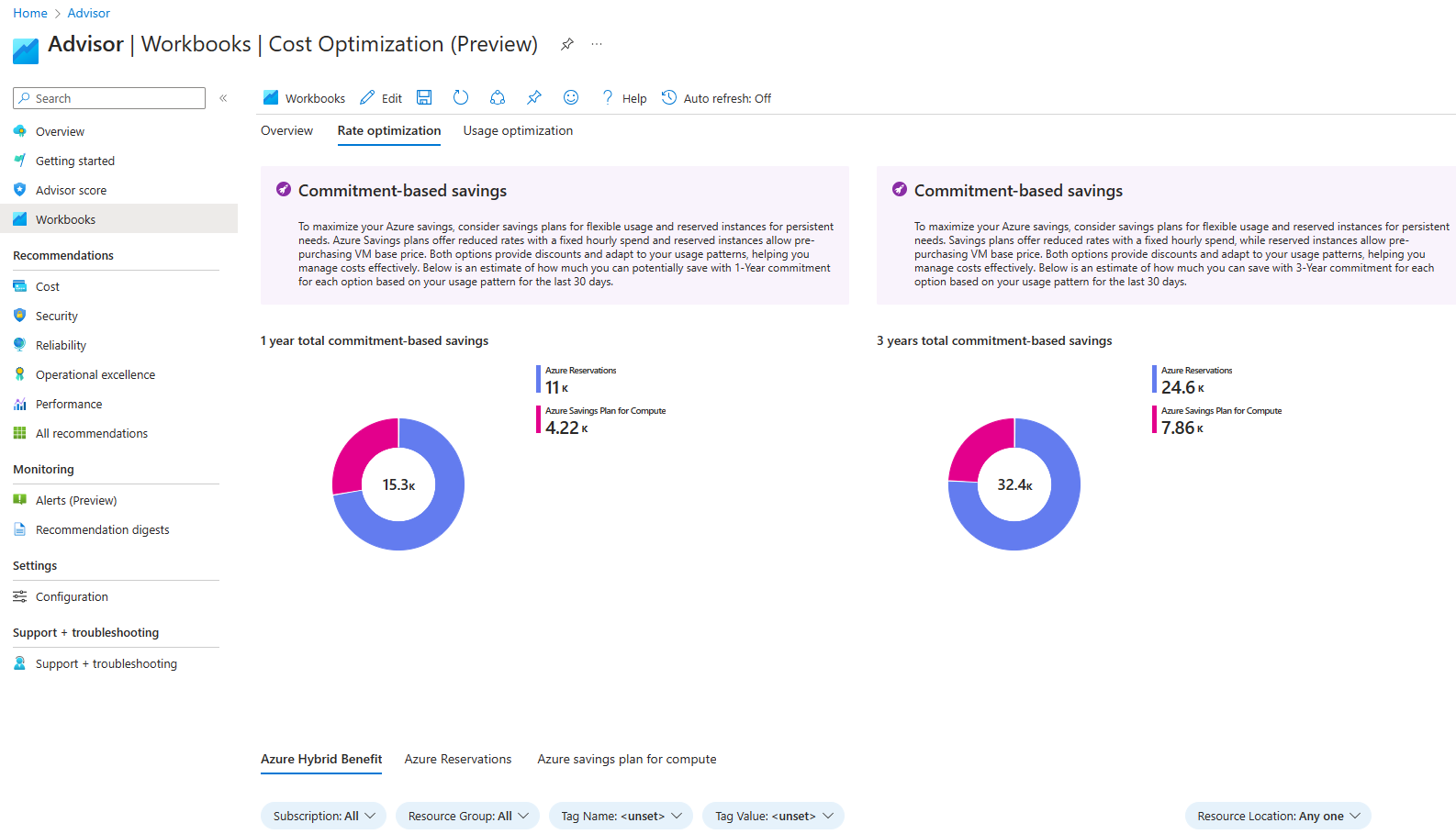 Azure 成本优化工作簿充当一些最常用工具的集中中心,这些工具可帮助实现利用率和效率目标。 它提供一系列建议,包括 Azure 顾问成本建议、空闲资源识别以及管理未正确解除分配的虚拟机。 此外,它还提供了应用 Azure 预留和计算节省计划的建议,以及使用 Azure 混合权益选项的见解。 Azure 顾问库中提供了工作簿模板。