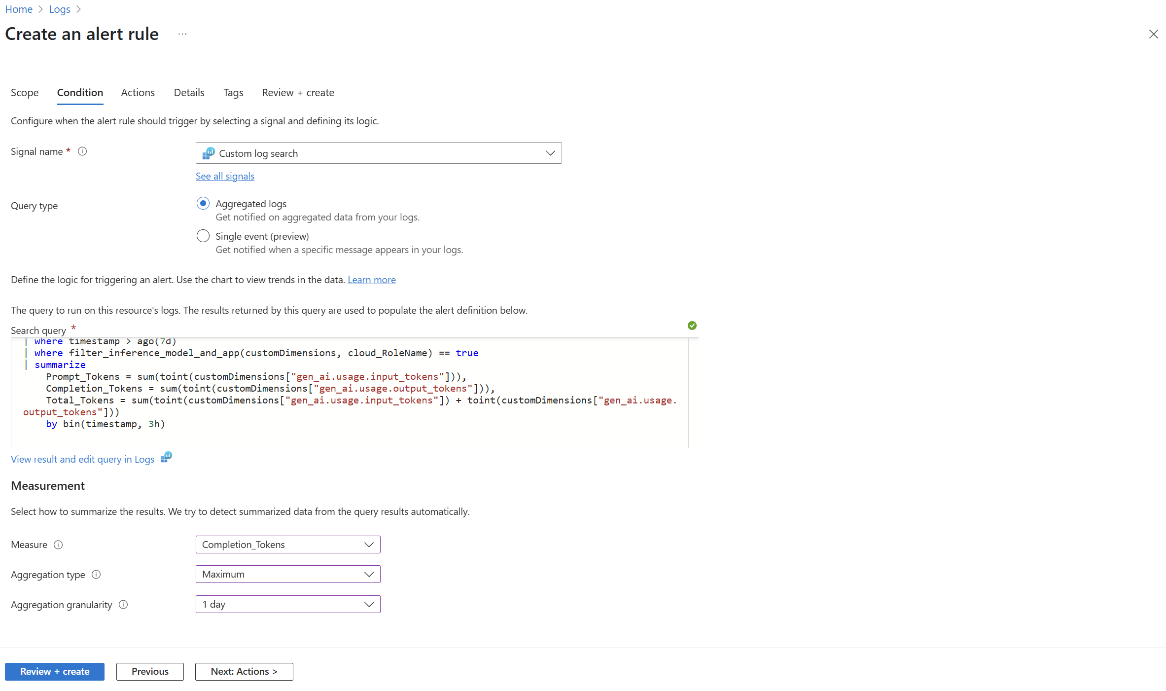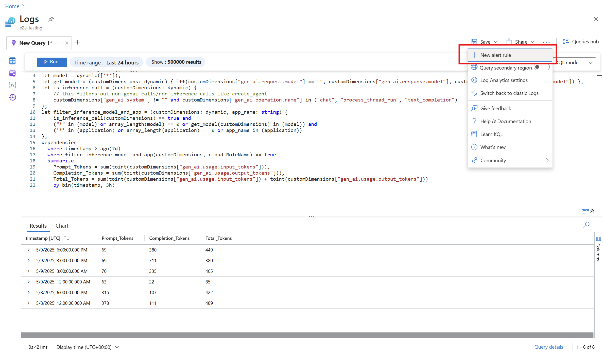 可以根据以前的 KQL 查询定义 Azure 警报规则,以在将来主动检测生产后作的问题。 选择 ... 以查看更多选项,例如 “新建警报规则”。