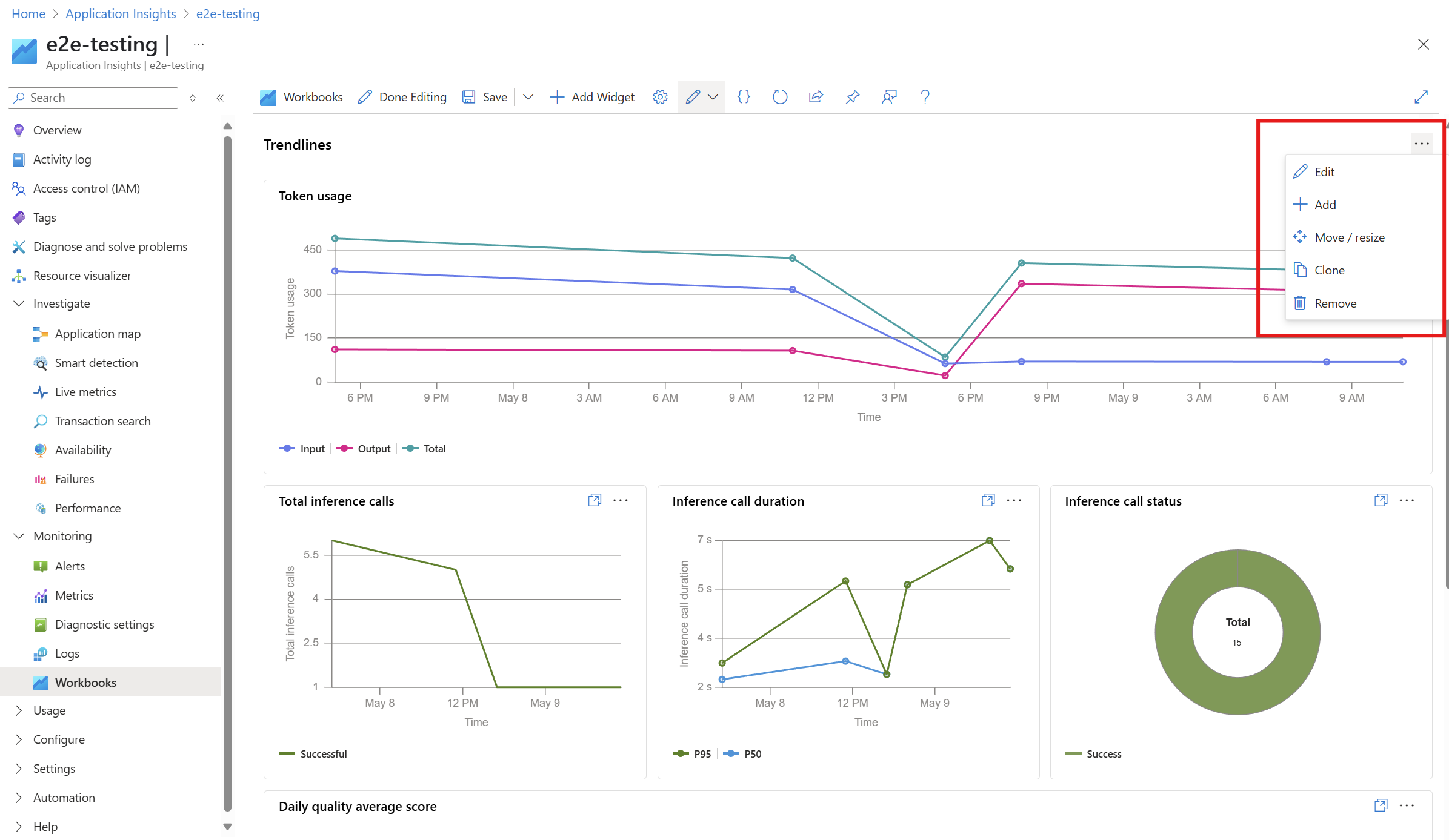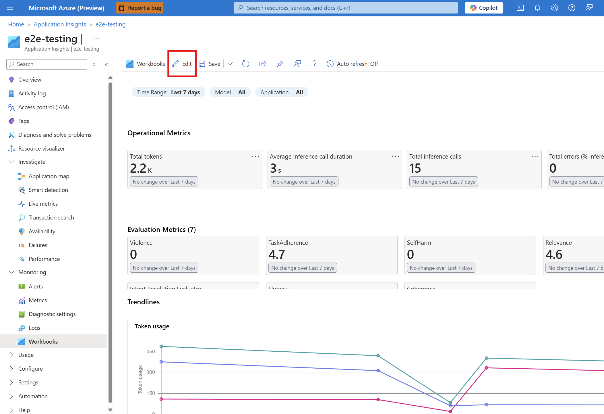 在 Foundry 门户中, 应用程序分析 仪表板视图使用 来自 Azure Monitor Application Insights 的信号,通过 Azure 工作簿 对其进行查询并创建可视化效果。