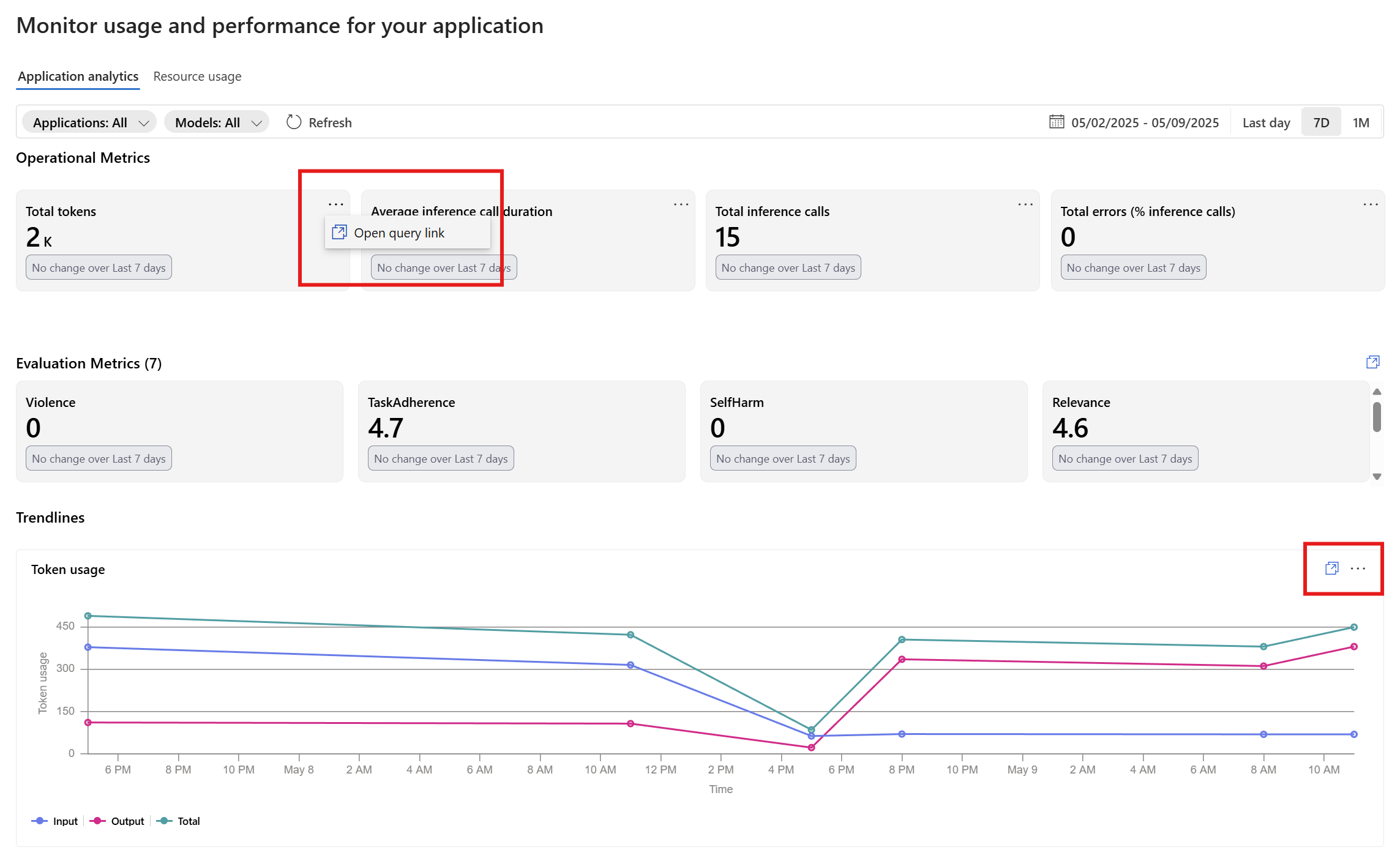 在“应用程序分析”仪表板视图中,可以选择特定磁贴或图表右上角的图标来打开查询链接。