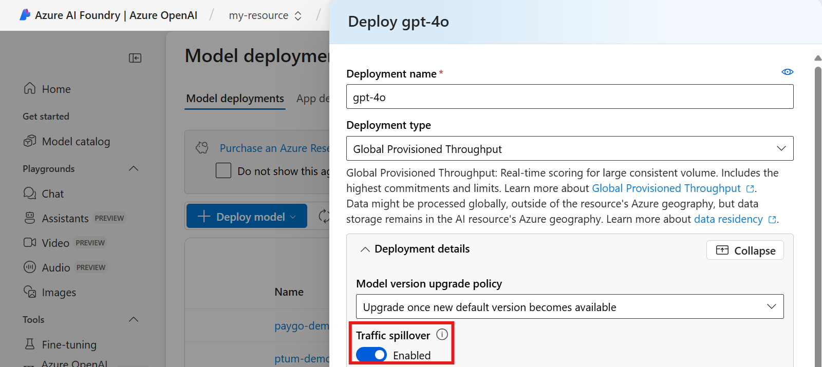 将预配选项指定为 部署类型,例如 全局预配吞吐量。 选择 “流量溢出” ,为预配的部署启用溢出。