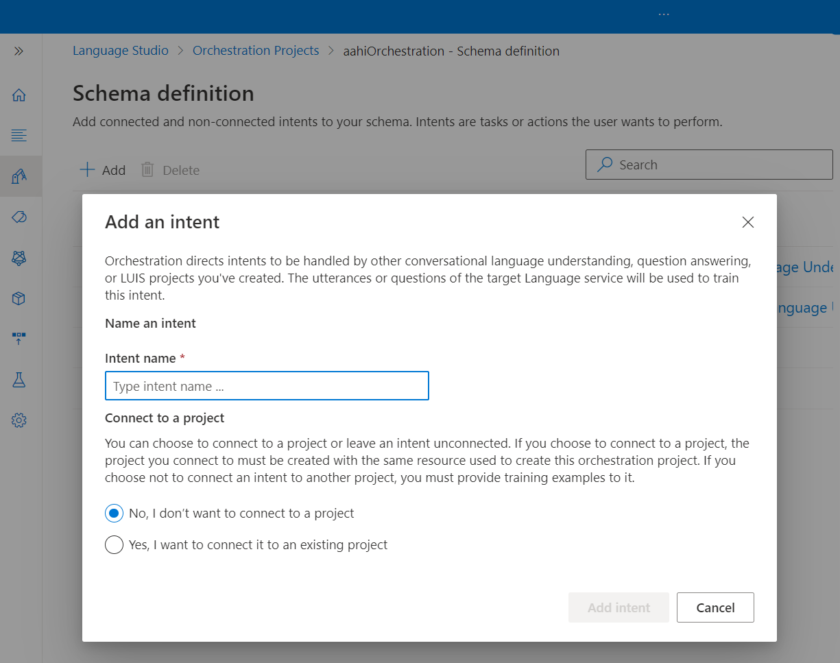 要创建新意向,请选择“+添加”按钮,开始为意向提供一个名称。 你可以看到两个选项,一个用于连接到项目,一个用于不连接到项目。 你可以连接到(LUIS、问题解答或对话语言理解)项目,或者选择“否”选项。