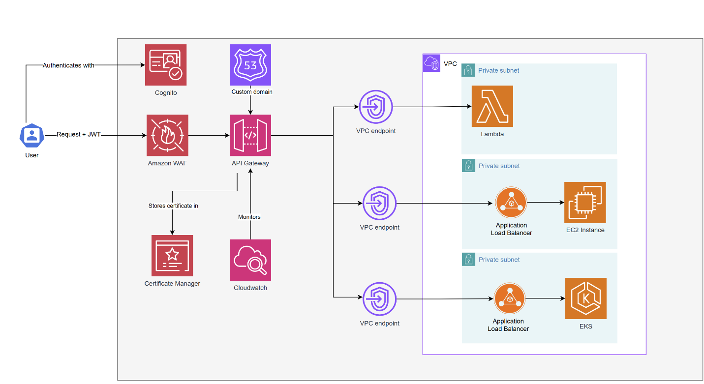 - Amazon API 网关连接到 VPC 中的应用程序负载均衡器,进而为 AWS EKS 提供入口。