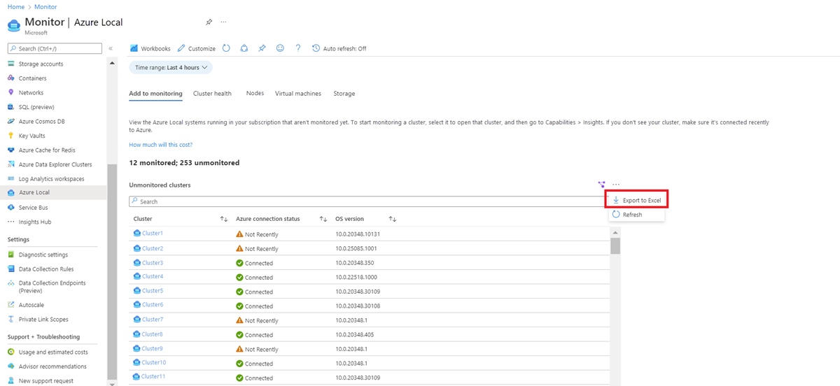 此功能提供用户未监视的群集的详细信息。 若要开始监视群集,请选择它以打开该群集,然后选择功能 > 见解。 如果未看到群集,请确保它最近已连接到 Azure。