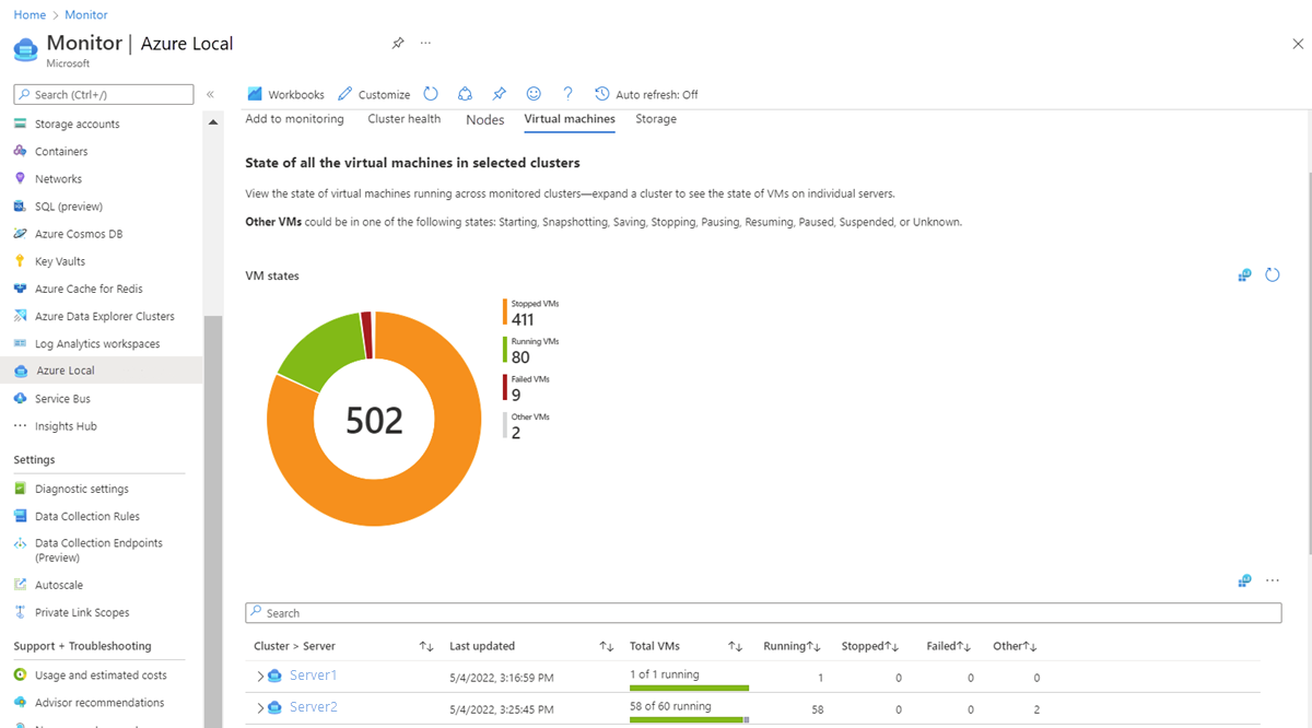 此视图提供所选群集中所有 VM 的状态。 此视图是使用 Microsoft-Windows-SDDC-Management/操作 Windows 事件日志通道的虚拟机事件 ID 3003 生成的。 每行可以进一步展开以查看 VM 在群集中各个节点之间的分布情况。 可与群集和节点资源交互,以导航到相应的资源页。