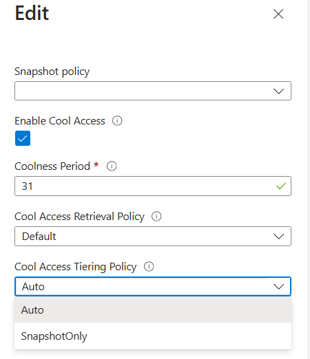 - 在为容量池配置支持冷访问卷的选项后,无法在容量池级别禁用该设置。 可以随时在卷级别打开或关闭冷访问设置。 在卷级别禁用冷访问设置会停止进一步的数据分层。