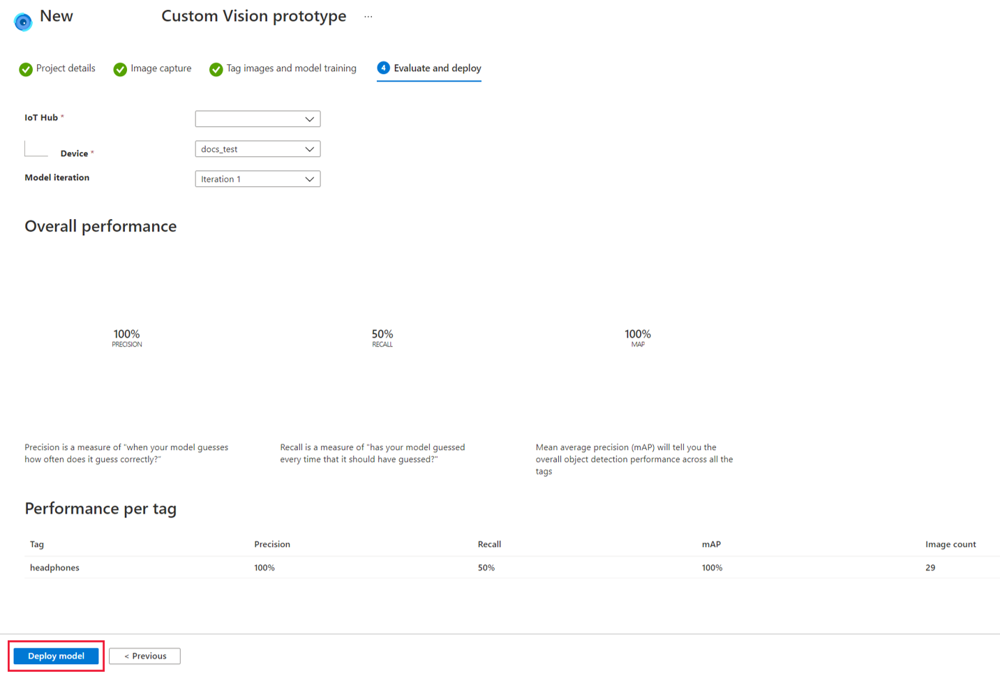 “评估和部署”窗口将显示所选模型迭代的性能。 在“模型迭代”下拉菜单中选择要部署到开发工具包的迭代,然后单击屏幕底部的“部署模型” 。