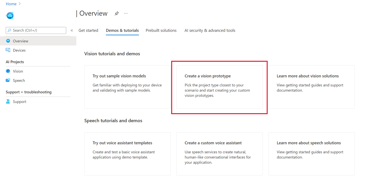 关闭此窗口后,可在 Azure Percept Studio 主页上的“AI 项目”下单击“视觉”,然后选择你的视觉项目名称,随时回来编辑该项目 。