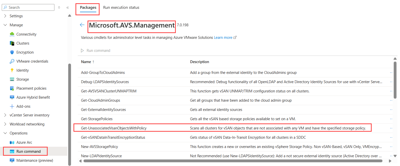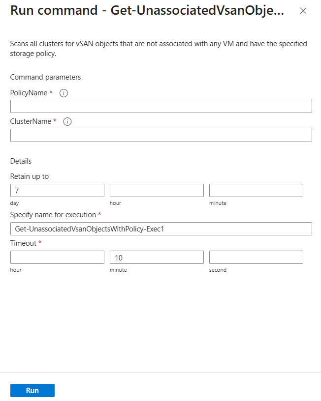 - 选择“运行命令”“包”>“Microsoft.AVS.Management”“Get-UnassociatedVsanObjectsWithPolicy”>>。
