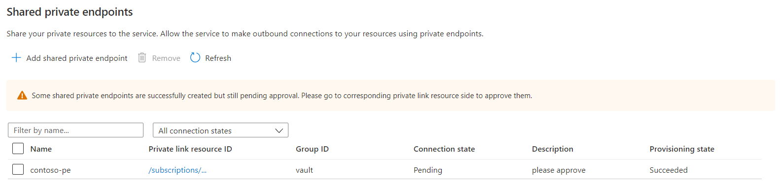 批准状态需要在几分钟后才会传播到 Azure Web PubSub 服务。 你可以使用 Azure 门户或 Azure CLI 来检查状态。 容器处于已批准状态后,Azure Web PubSub 服务和 Azure 密钥保管库之间的共享专用终结点将处于活动状态。