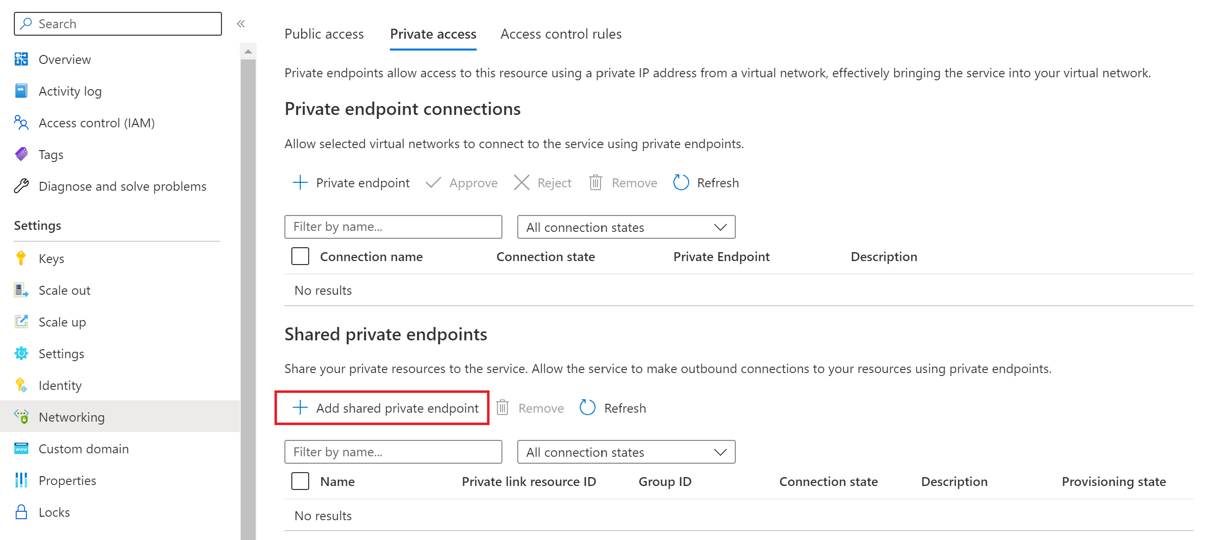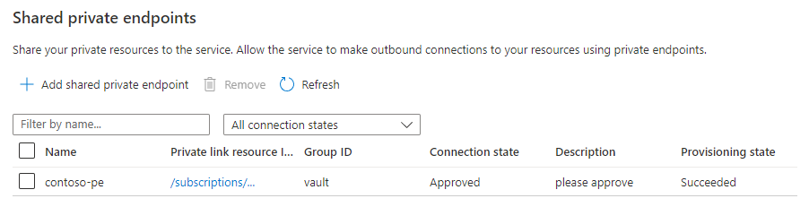 通过 Azure Web PubSub API 创建的安全资源的专用终结点称为“共享专用链接资源”。 可以“共享”对与 Azure 专用链接集成的资源(例如 Azure Key Vault 实例)的访问权限。 这些专用终结点在 Web PubSub 执行环境中创建,不会直接显示出来。
