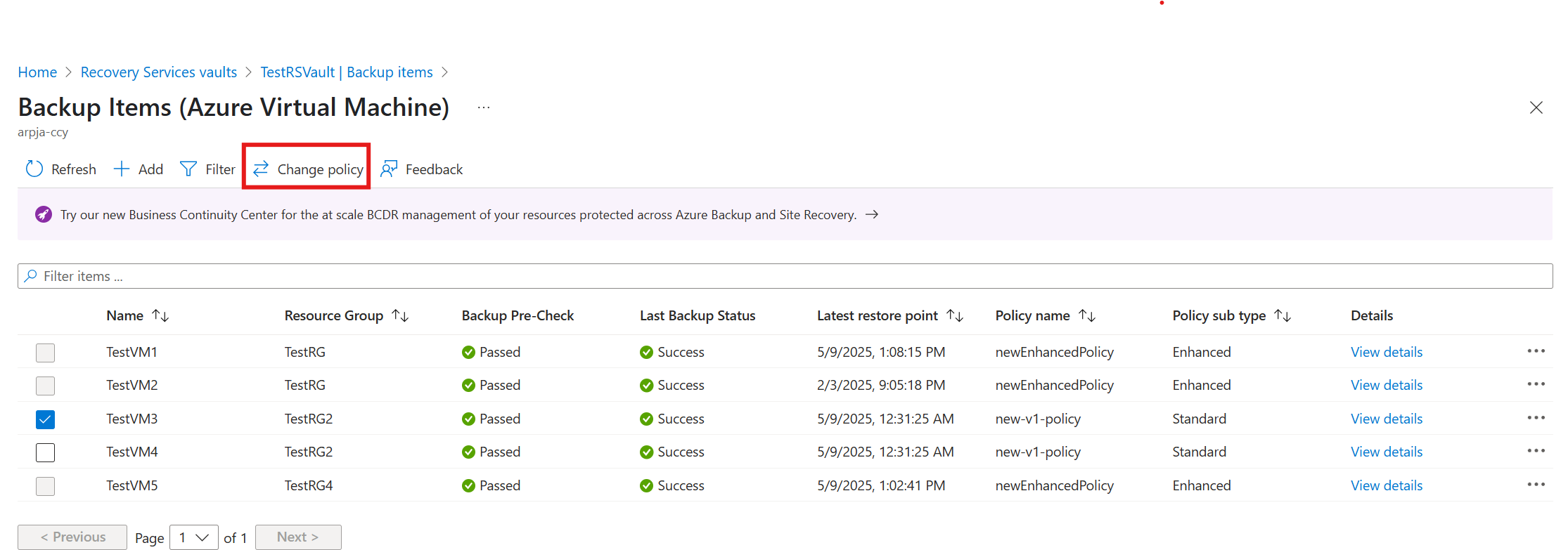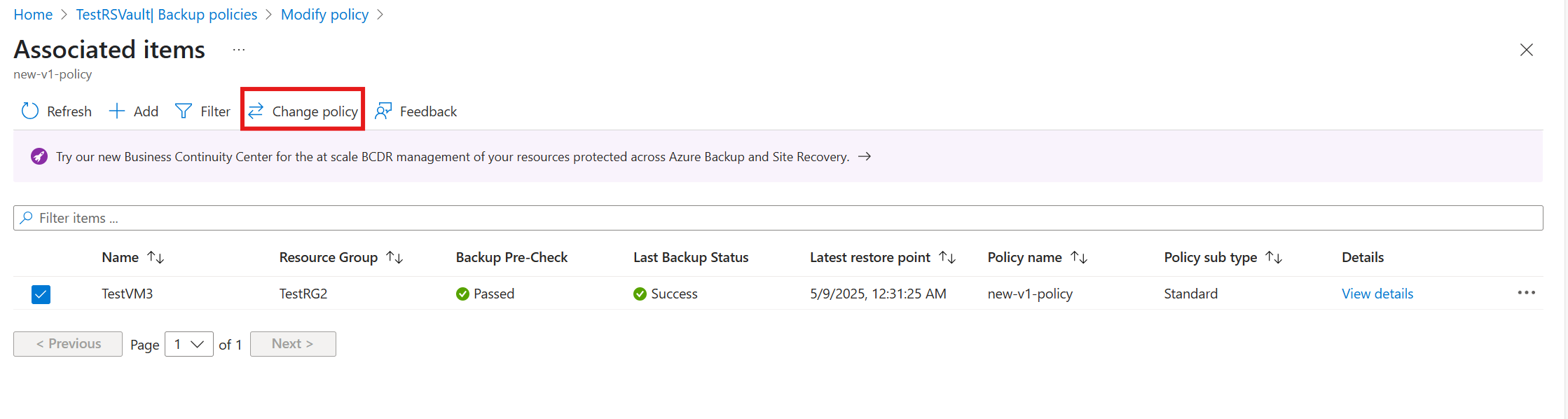 在“ 备份项 ”窗格中,从要迁移的受保护 VM(使用标准策略)列表中选择 VM,然后选择“ 更改策略”。