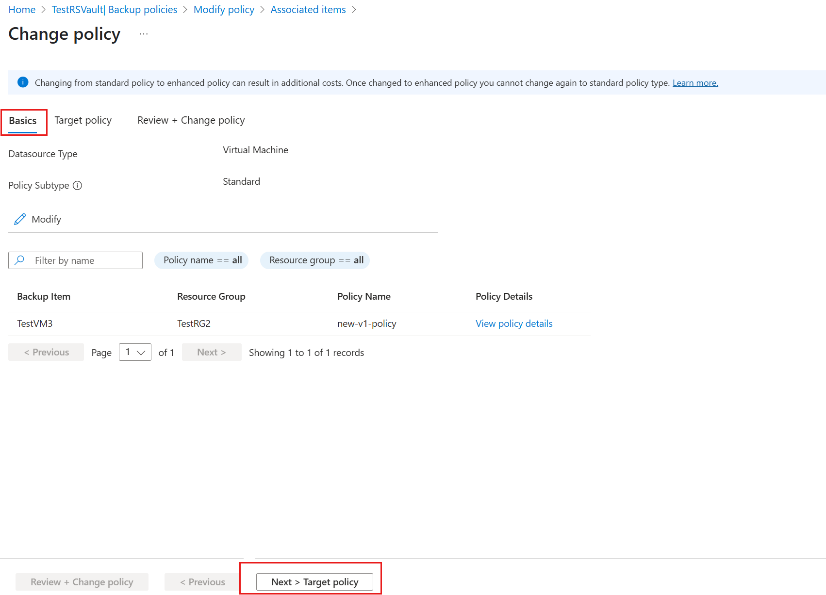 在 “更改策略 ”窗格的“ 基本信息 ”选项卡上,查看 VM 的选择,然后选择“ 下一目标 > ”策略。