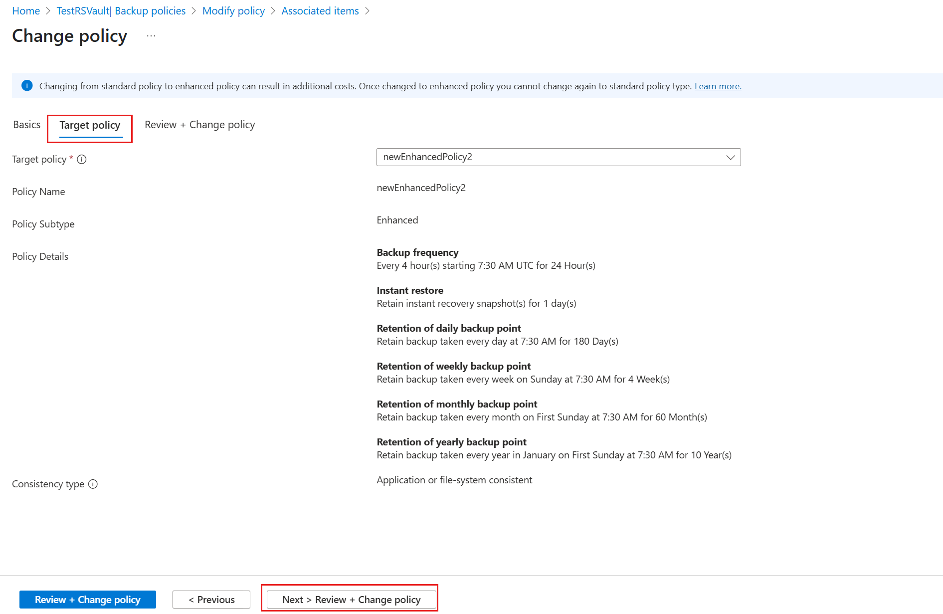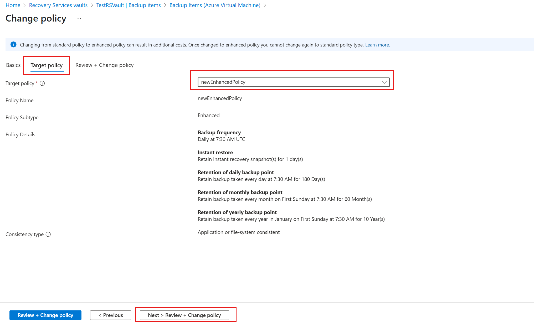 在“ 更改备份策略 ”窗格中,选择“ 策略”子类型 作为 “增强”,选择要应用于虚拟机的 备份策略 ,然后选择“ 更改”。