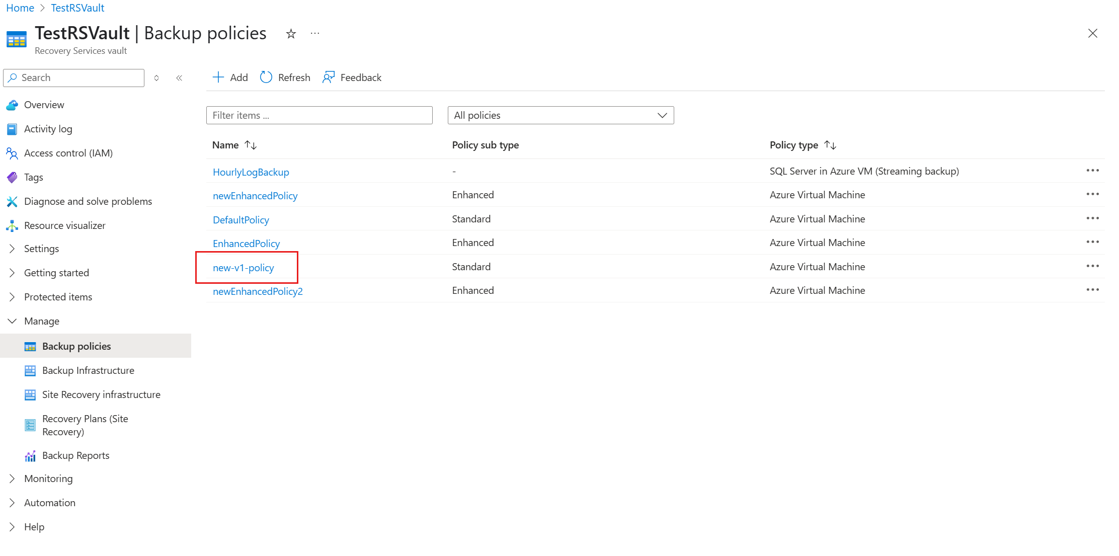 标准策略仅支持通过 CLI(版本 2.73.0 及更高版本)、PowerShell(版本 Az 14.0.0 及更高版本)和 REST API(版本 2025-01-01-01 及更高版本)进行备份。 若要为受标准策略保护的现有 VM 启用受信任的启动,请先迁移到增强策略。