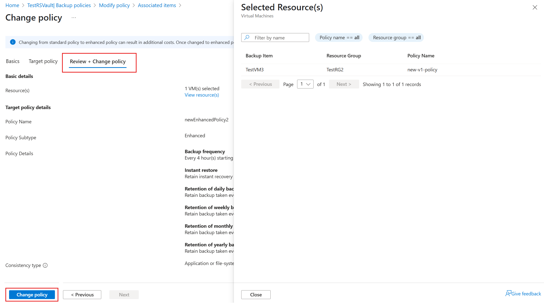 在“ 查看 + 更改策略 ”选项卡上,验证 VM 和目标策略的选择,然后选择“ 更改策略”。