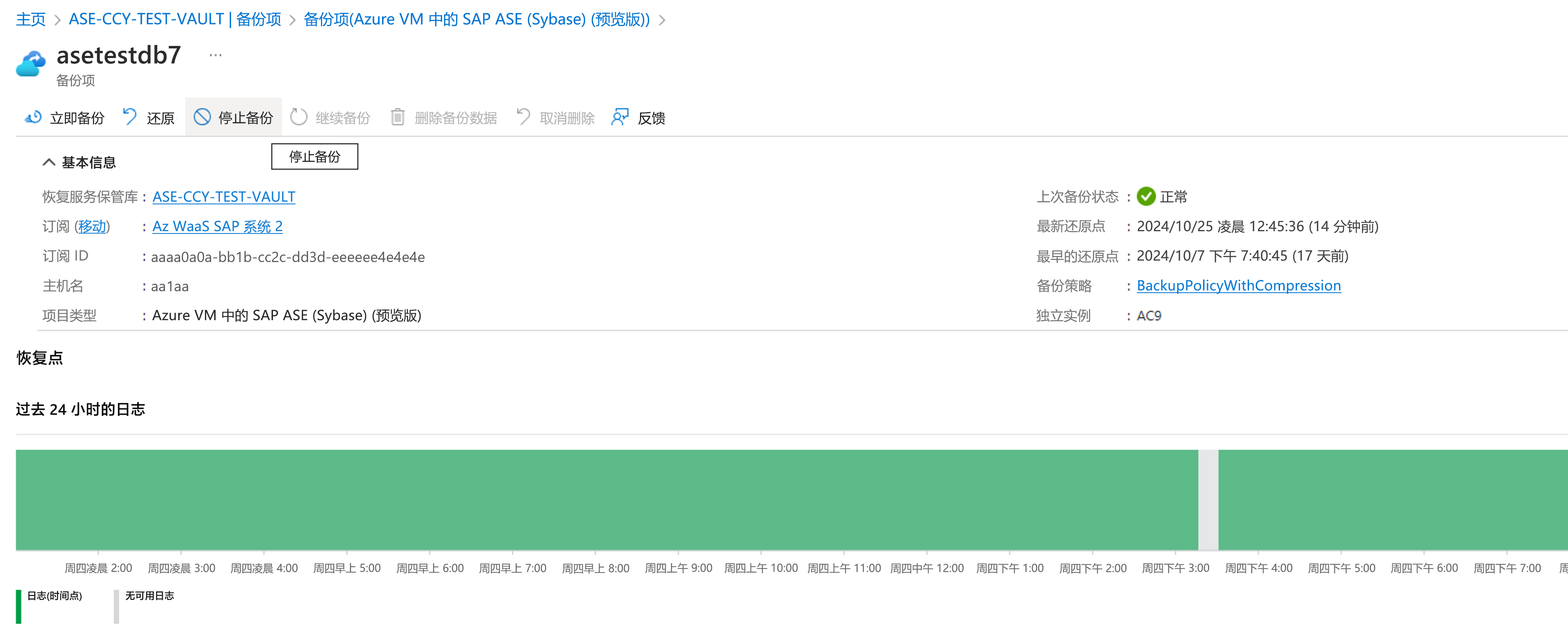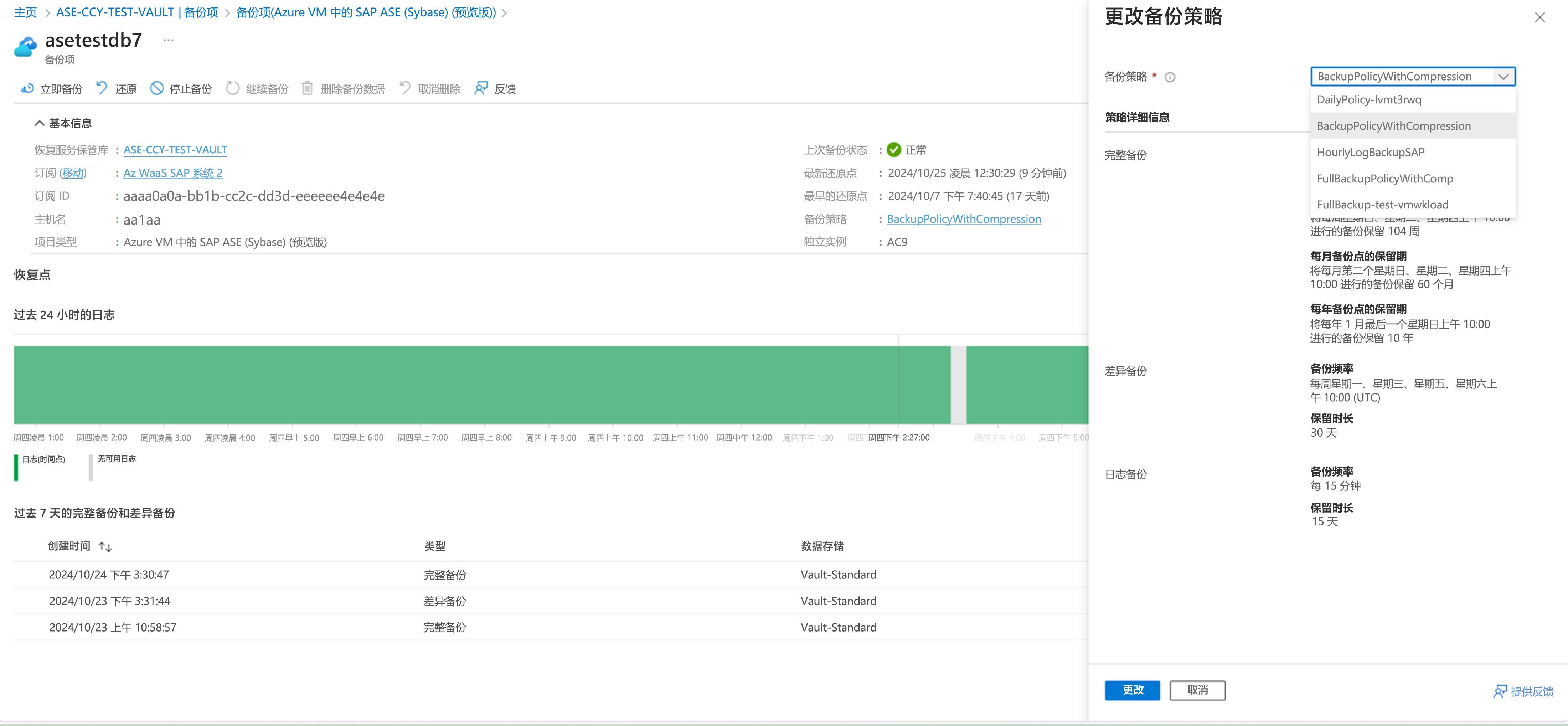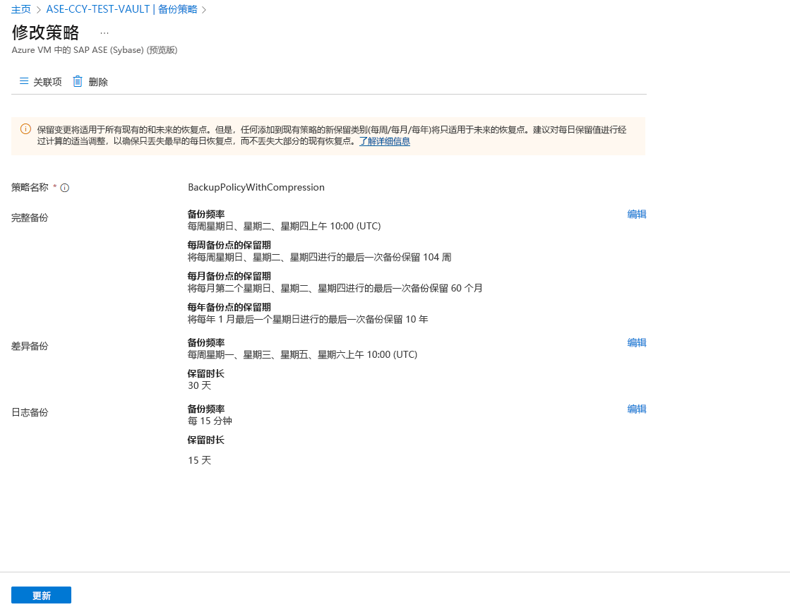 可以在以下位置更改 SAP ASE 备份项的基础策略 >“查看详细信息”>“备份策略”>“更改备份策略”。
