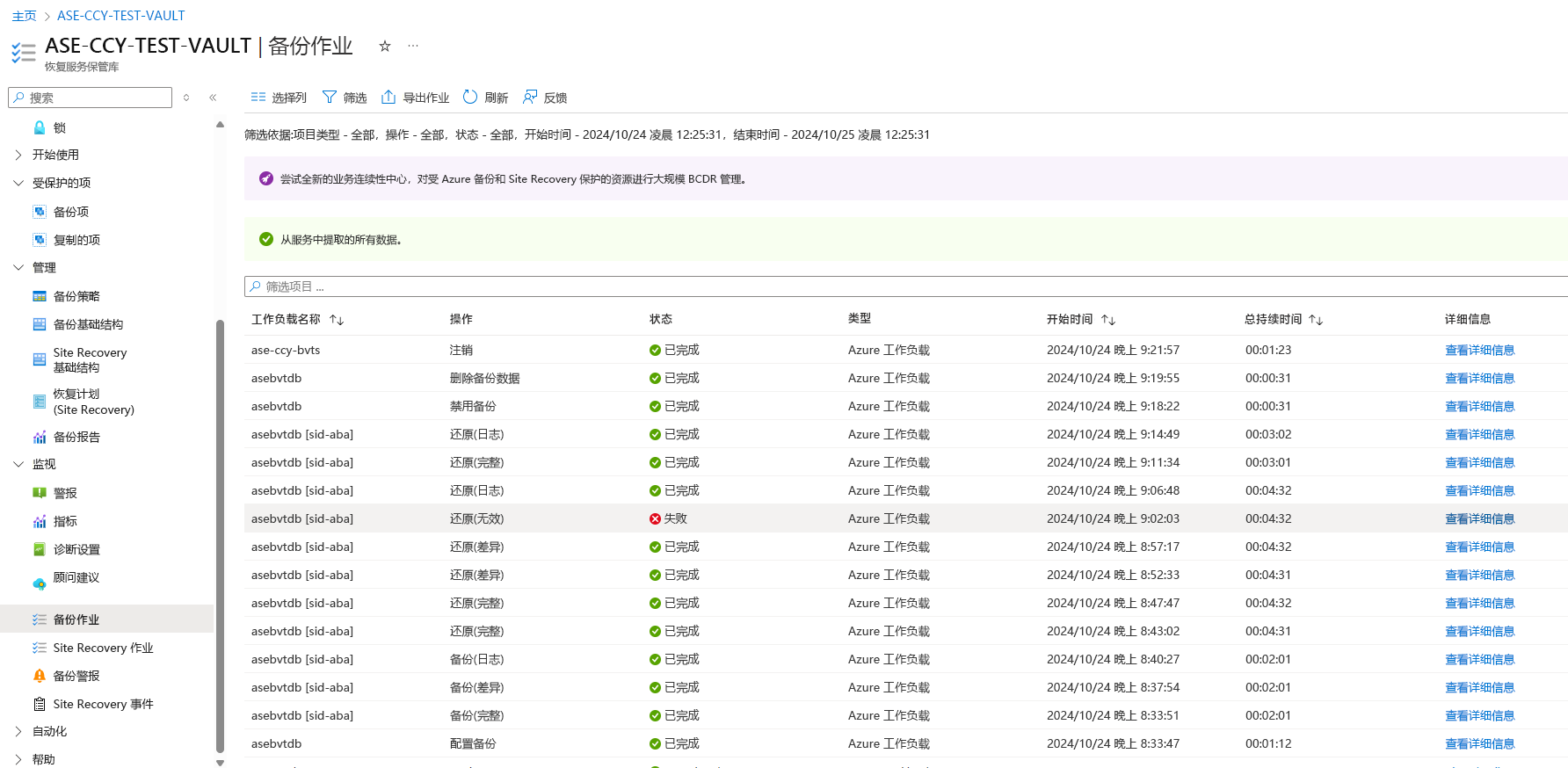 Azure 备份会在“恢复服务保管库”的“备份作业”部分显示所有手动触发的作业。