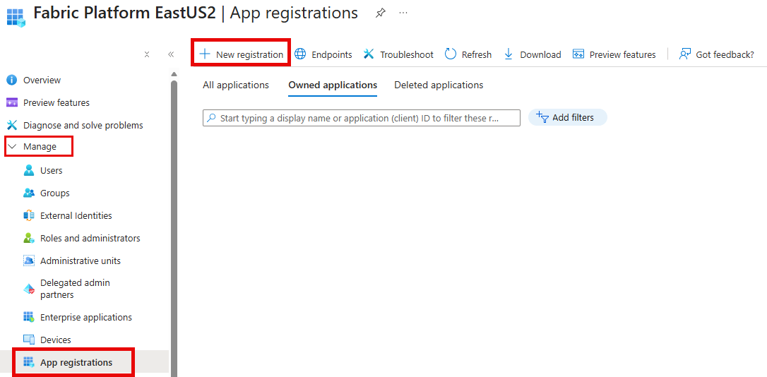 在左侧导航窗格中,转到 “管理”。 选择 “应用注册” ,然后选择 “新建注册”。