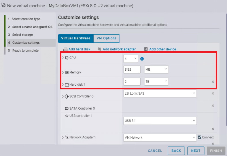 在 “自定义设置” 页上,将 CPU 设置为 4, 内存 设置为 8192 MB(或更多), 硬盘 1 设置为 2 TB(或更多)。 选择 SCSI 硬盘 进行添加。 在这种情况下,是 LSI Logic SAS。 不支持静态 IDE 磁盘。 硬盘 1 是虚拟数据磁盘。 预配磁盘后无法收缩。 尝试收缩磁盘会导致设备上的所有本地数据丢失。 不需要 CD/DVD 驱动器 1,应将其删除。