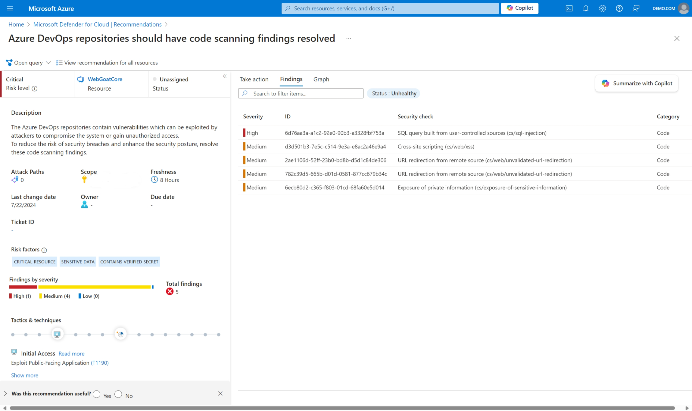 结果交付:系统在 Defender for Cloud 中以安全建议的形式显示调查结果,使安全团队能够查看和解决问题。