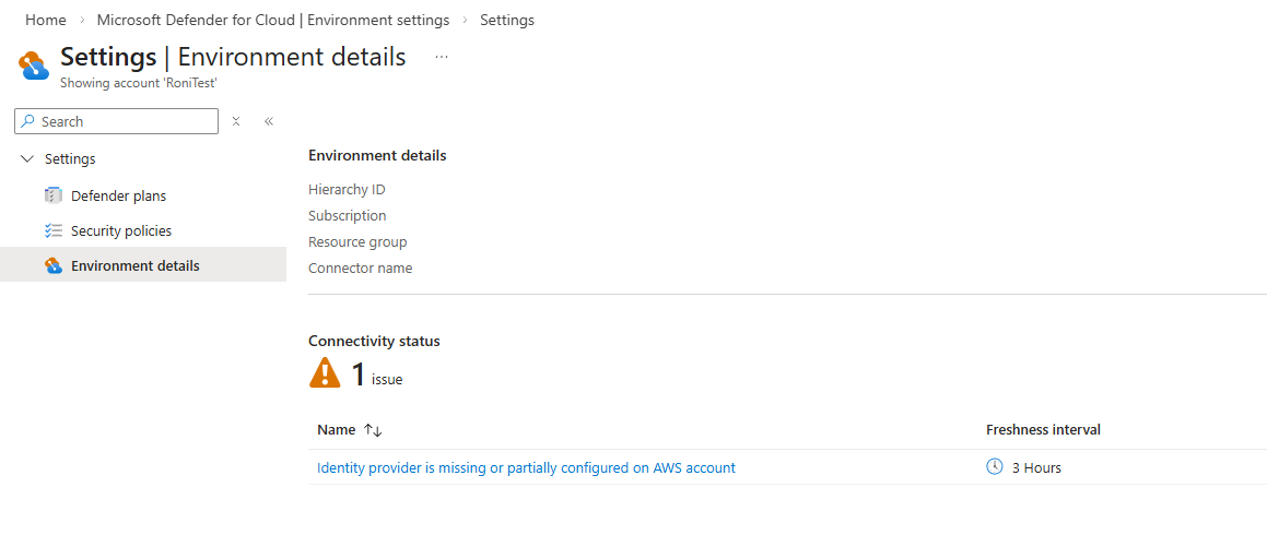 “环境详细信息”页列出了影响 AWS 帐户连接的任何检测到的配置或权限问题。
