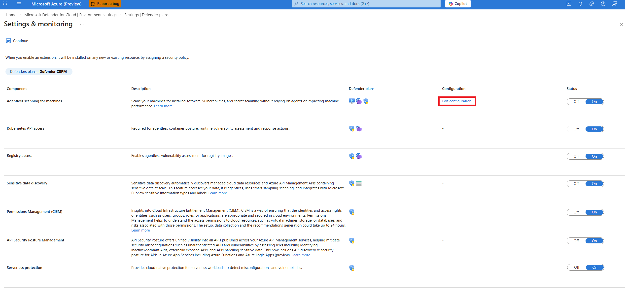 在订阅上启用 Defender CSPM 计划后,可以启用 Defender CSPM 计划的各个组件: