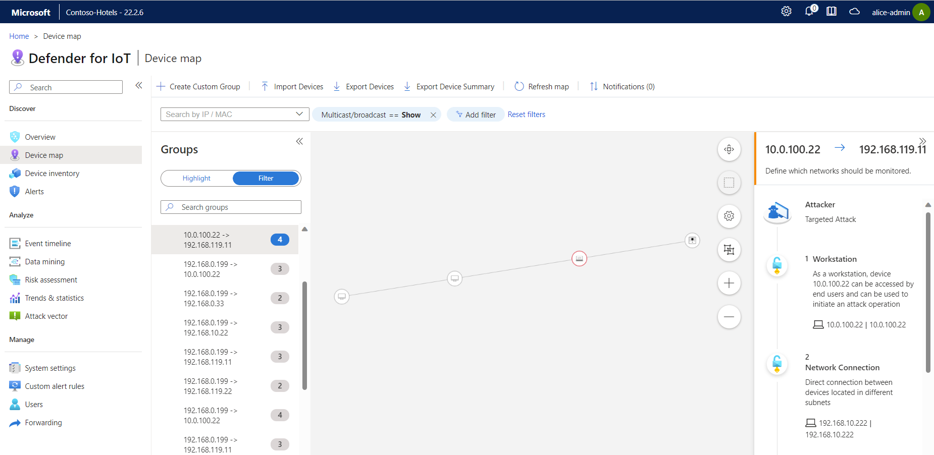 设备映射提供了在攻击途径报告中检测到的易受攻击设备的图形表示形式。 若要在设备映射中查看攻击途径,请执行以下操作: