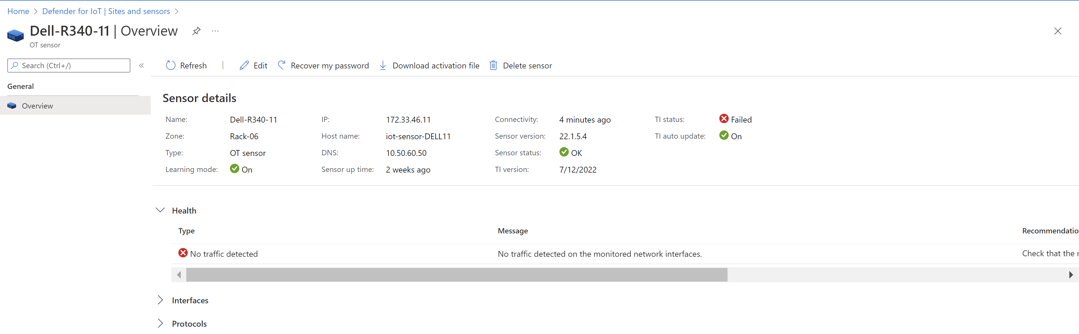 在传感器详细信息“概述”页上,展开“运行状况”部分和其中列出的所有消息,了解详细信息。 右侧的“推荐”列列出了应对健康问题的建议措施。