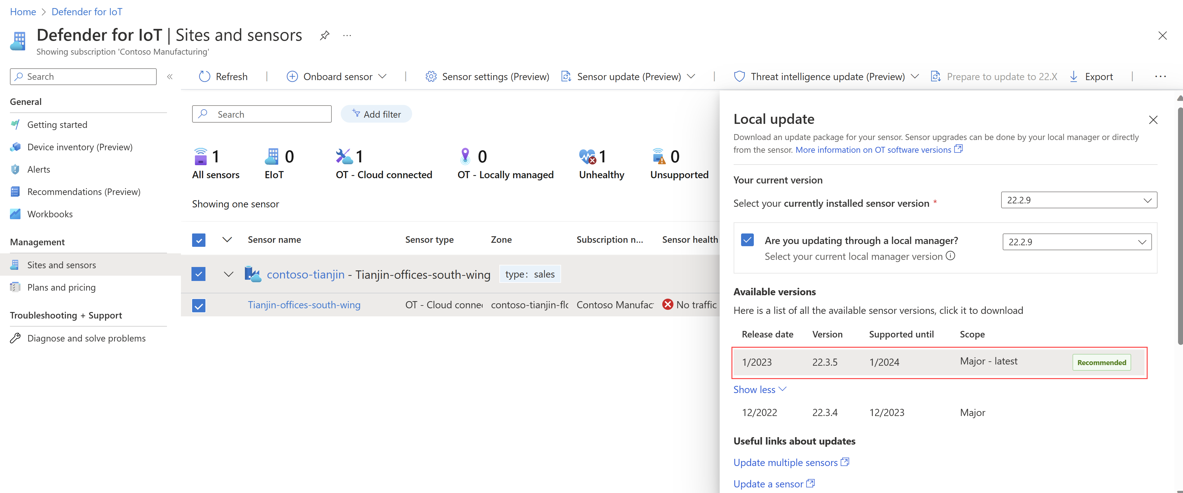 此过程介绍如何将软件版本更新发送到一个或多个站点的 OT 传感器,然后使用 Azure 门户远程运行更新。 建议通过选择站点而不是单个传感器来更新传感器。