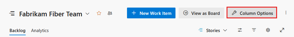 可以使用视图选项菜单设置各种选项来查看积压工作项。 若要了解根据要完成的任务设置的选项,请参阅配置积压工作视图。